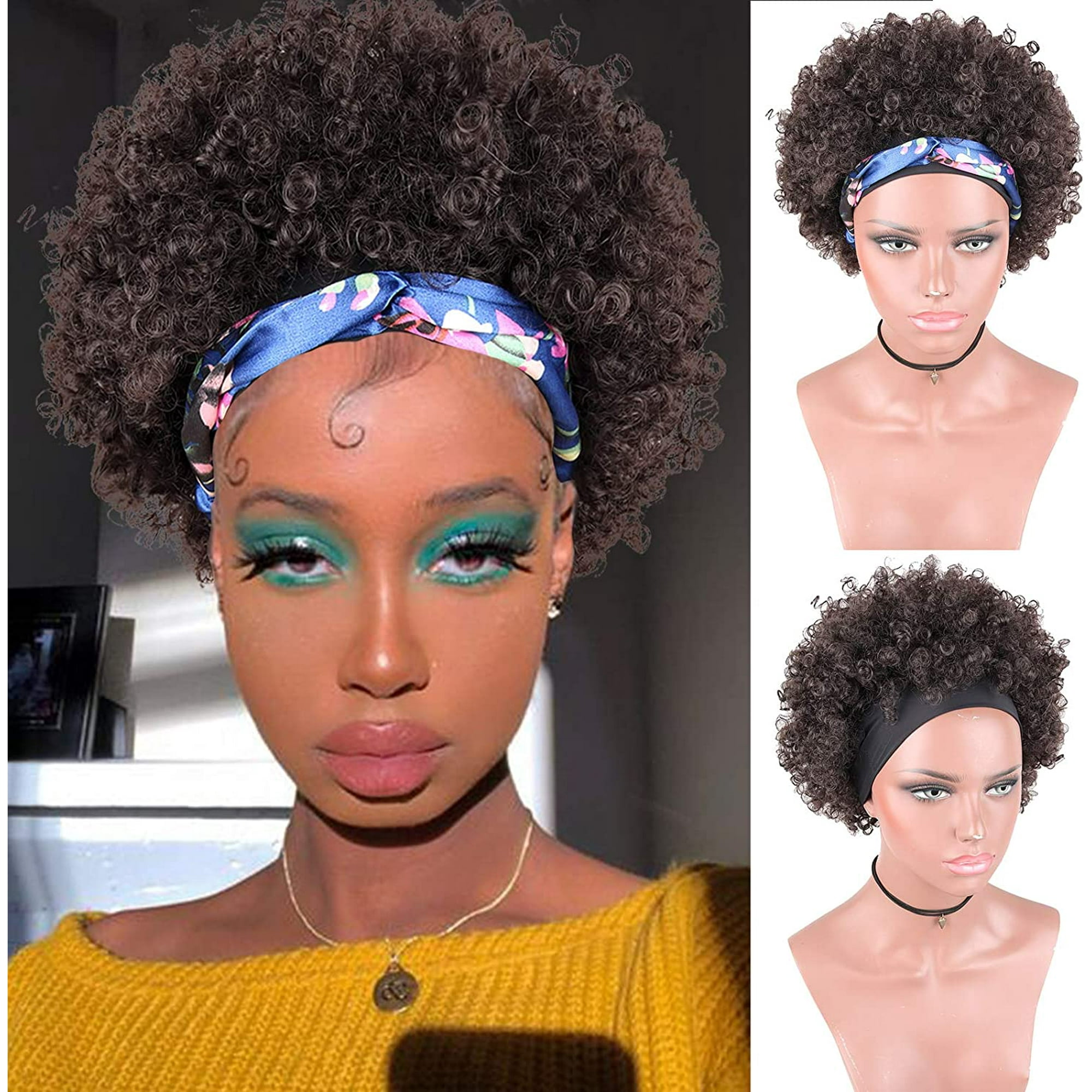 Headband Wig Afro Curly Wig For Black Women High Puff Scarf Wig Headwrap Wig 2 In 1 Short Black Wig Synthetic Wig For Women Turban Wig Kinky Curly Wig With Headband Attached